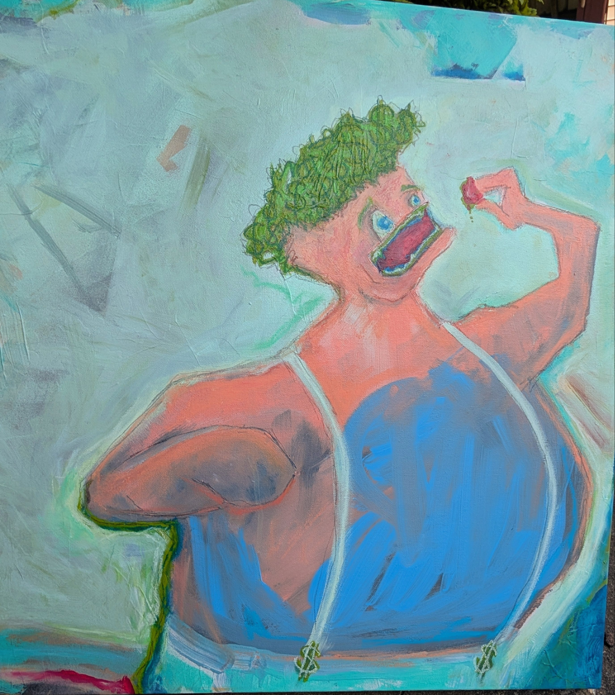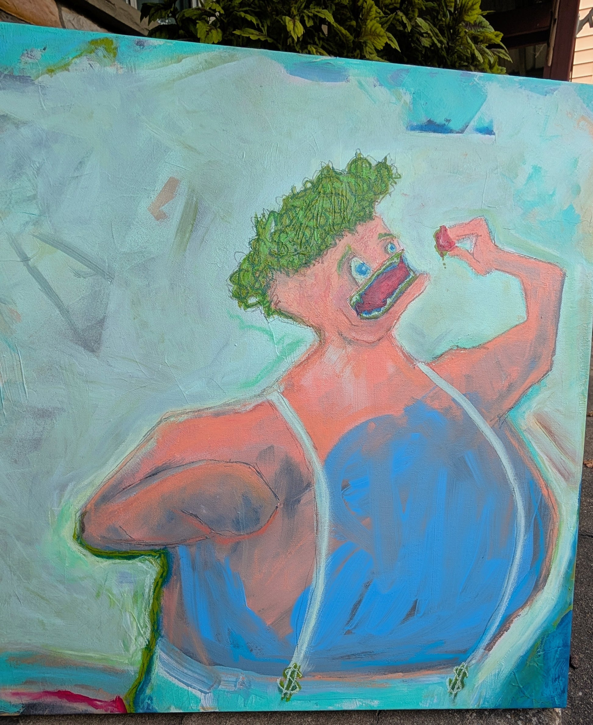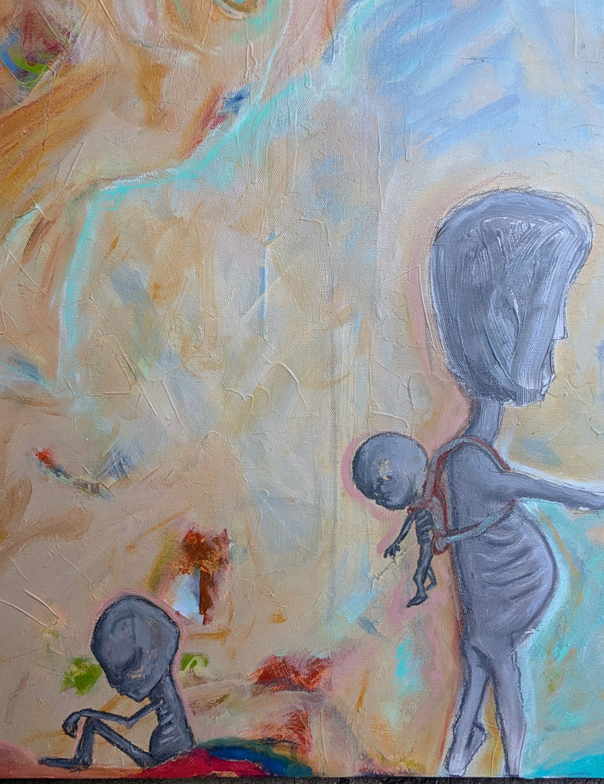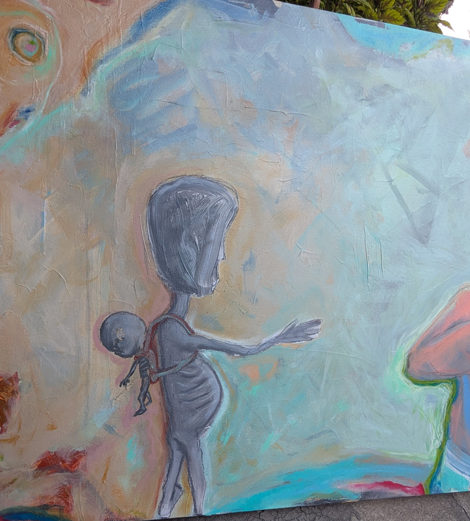 Acrylic paint and soft oil pastels on stretched 20 x 40-inch canvas