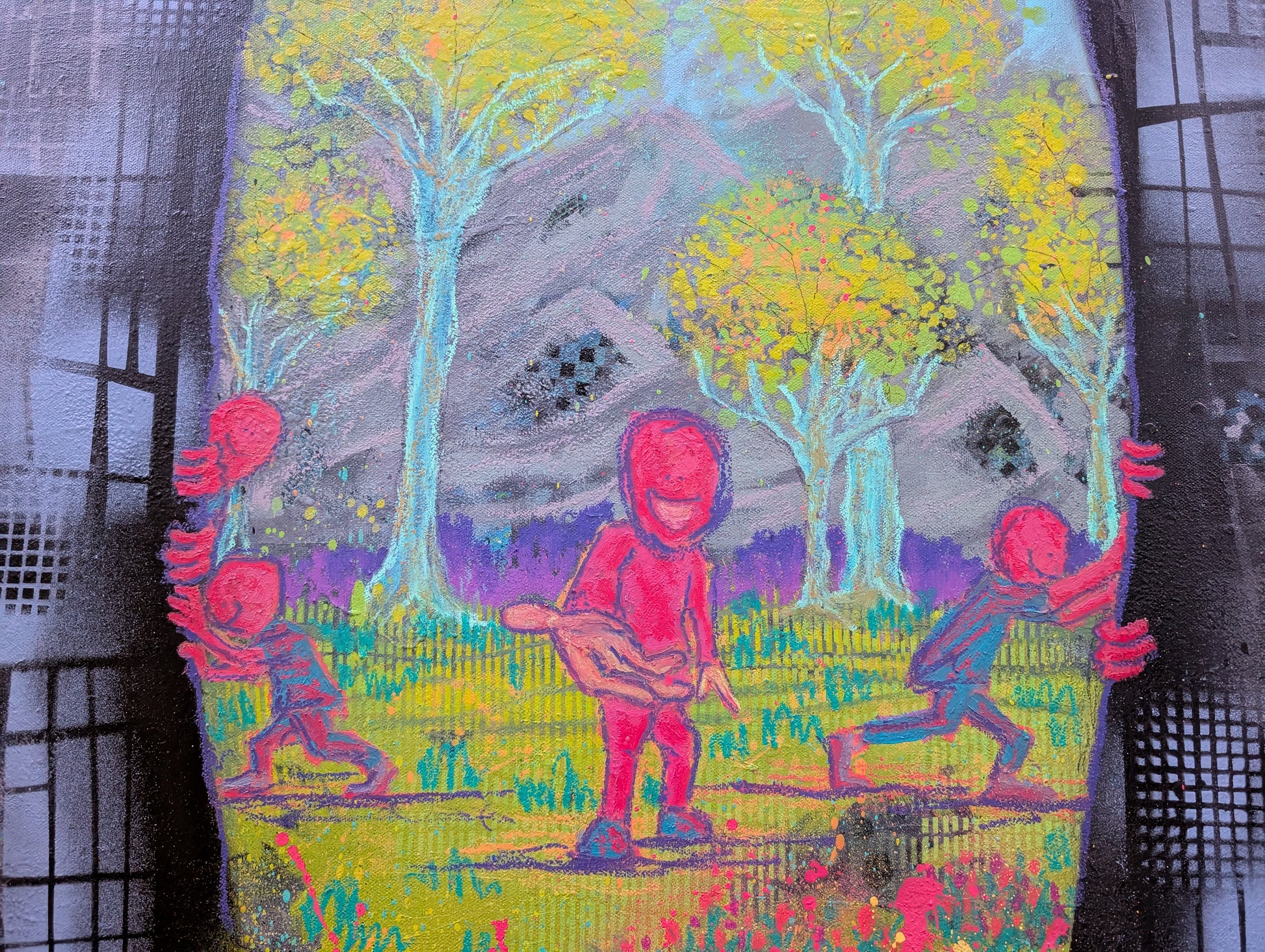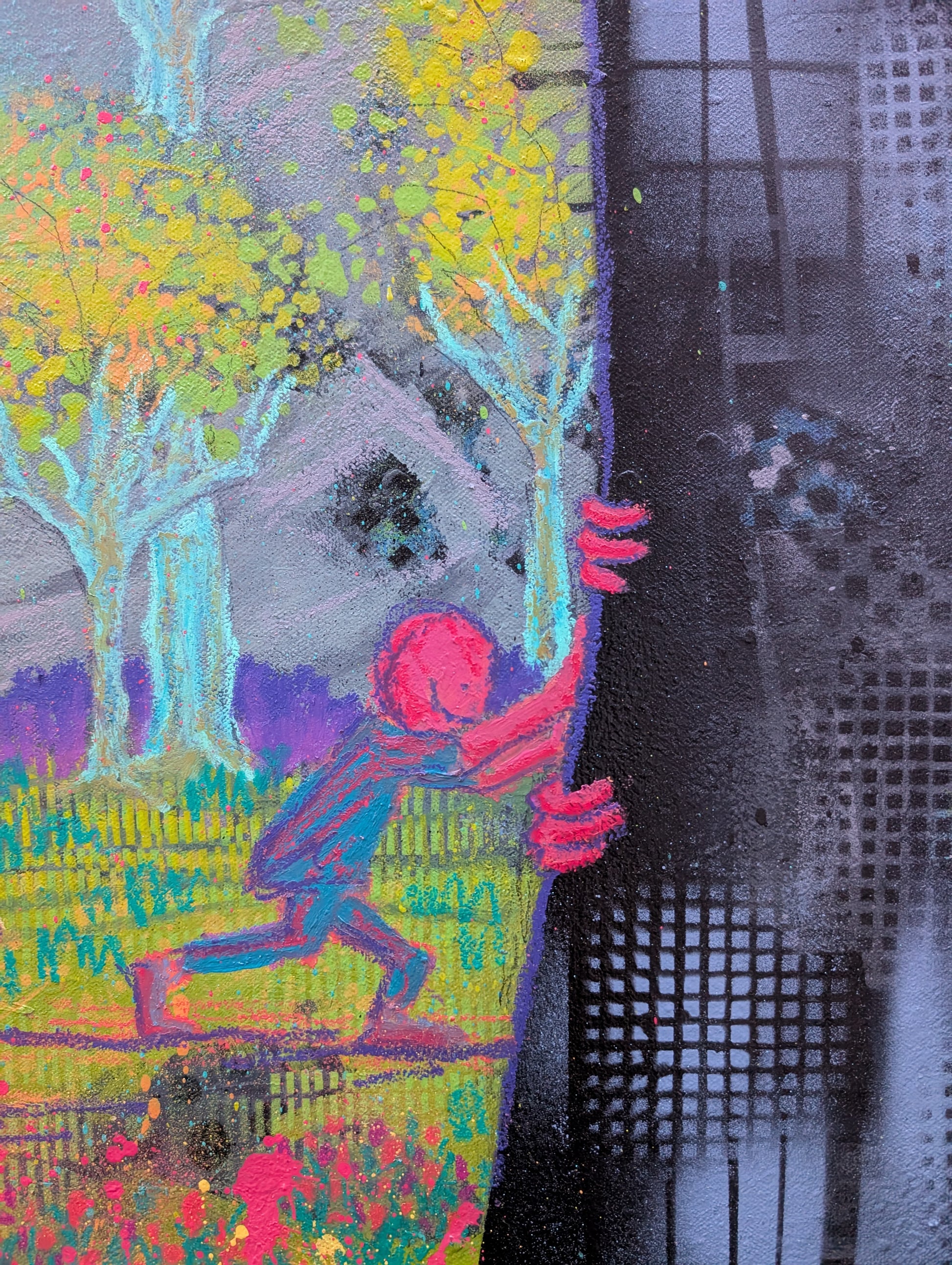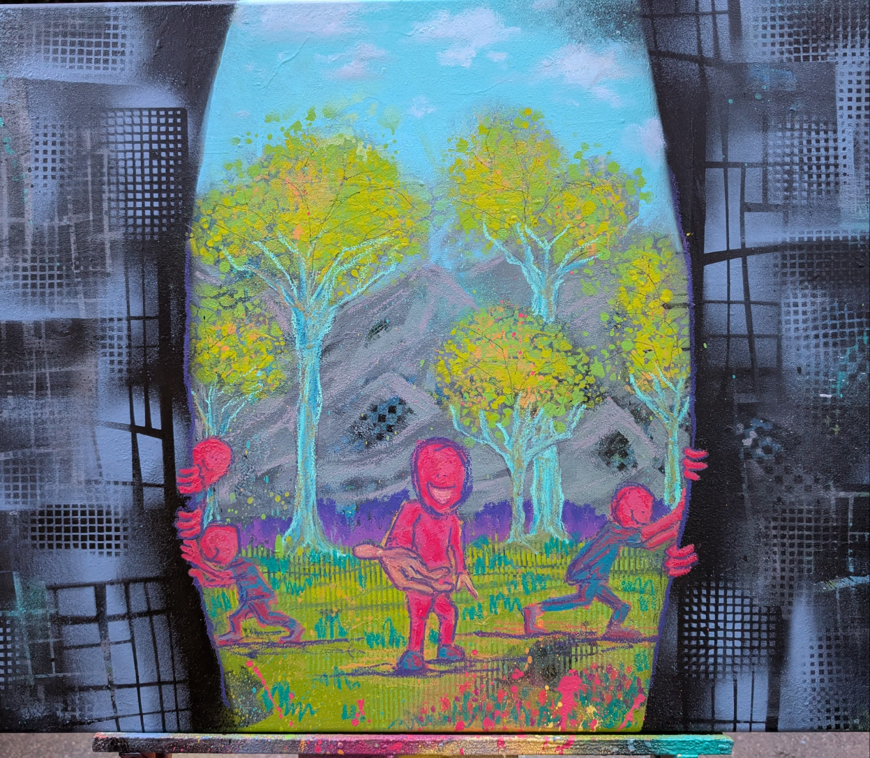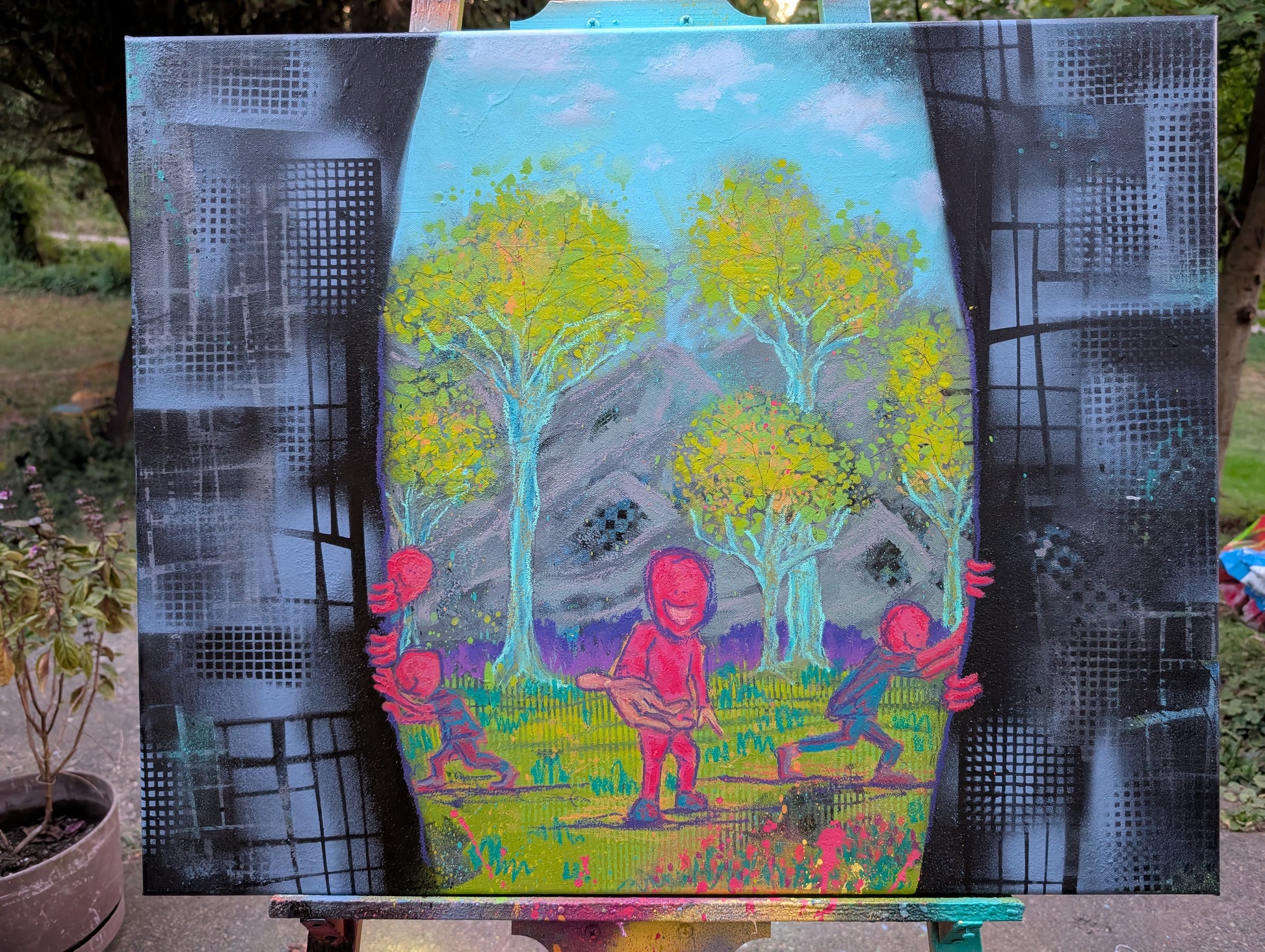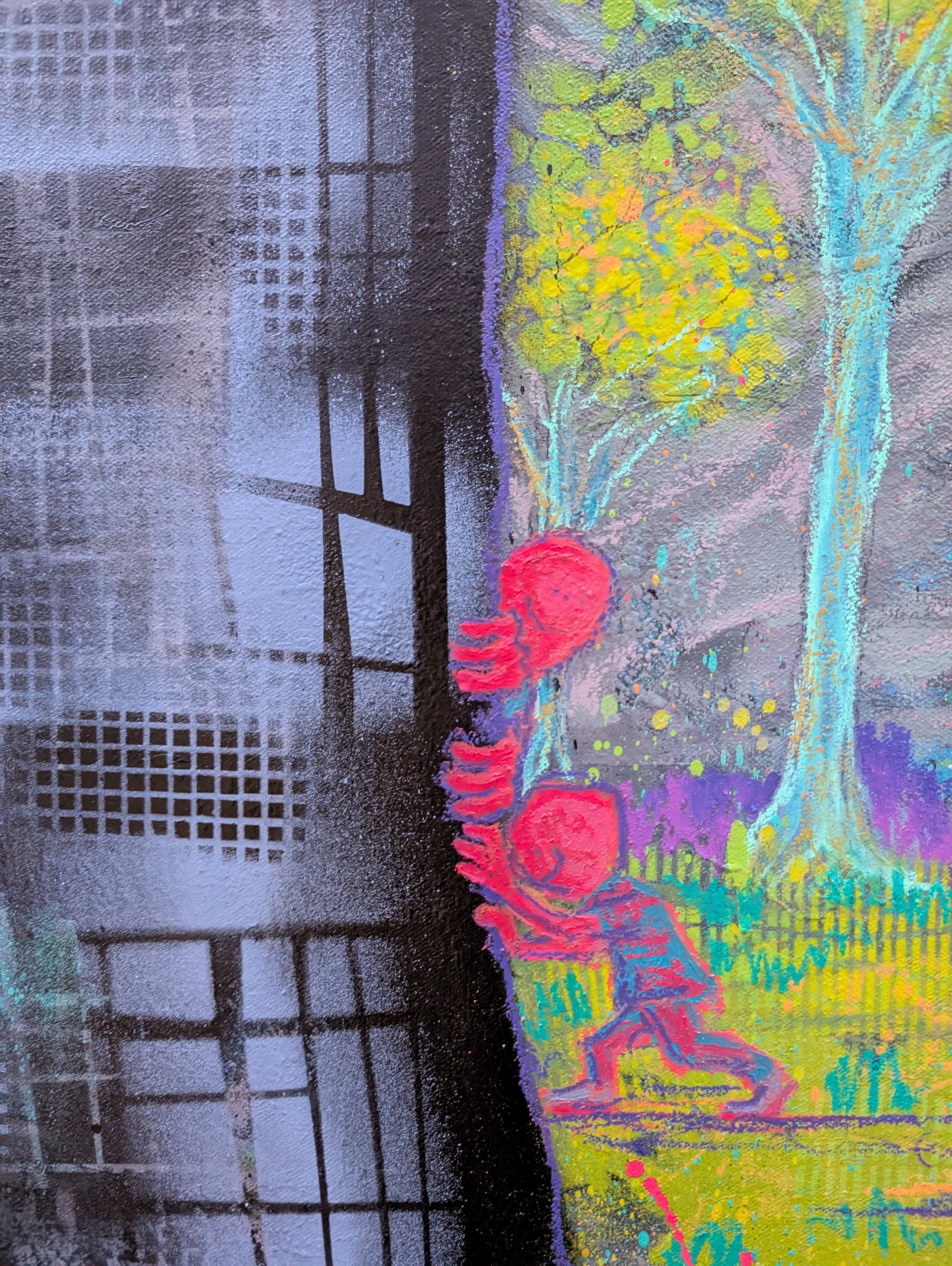 Acrylic paint, spray and soft oil pastels on stretched 24 x 30 low depth canvas