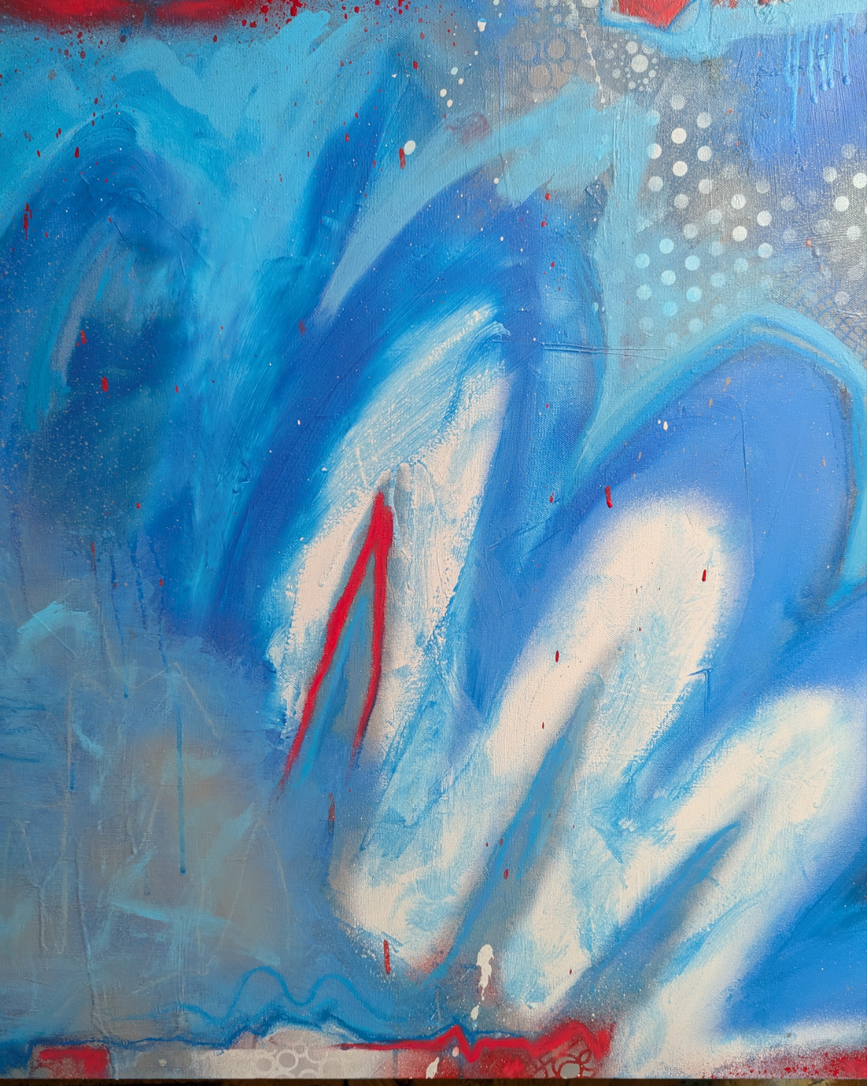 Acrylic paint, spray, and soft oil pastel on 30 x 40-inch stretched canvas